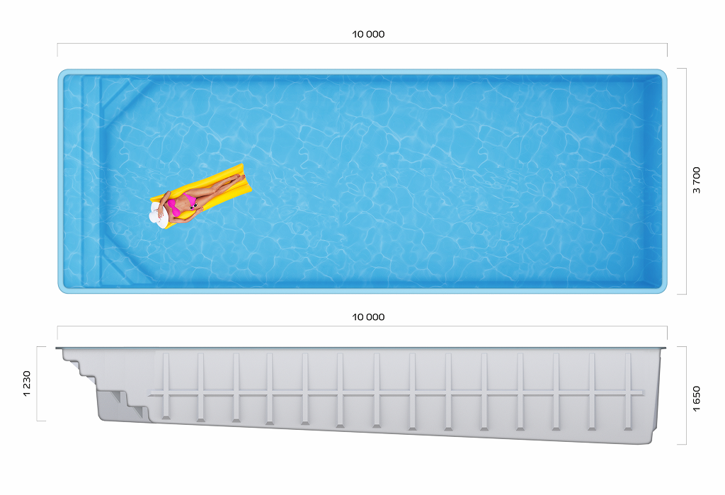 Изящные линии чаши и плавные переходы глубины создают ощущение естественного водоёма, а оптимальная ширина бассейна гарантирует комфорт — здесь никогда не будет тесно, даже если собрались все друзья и родственники.